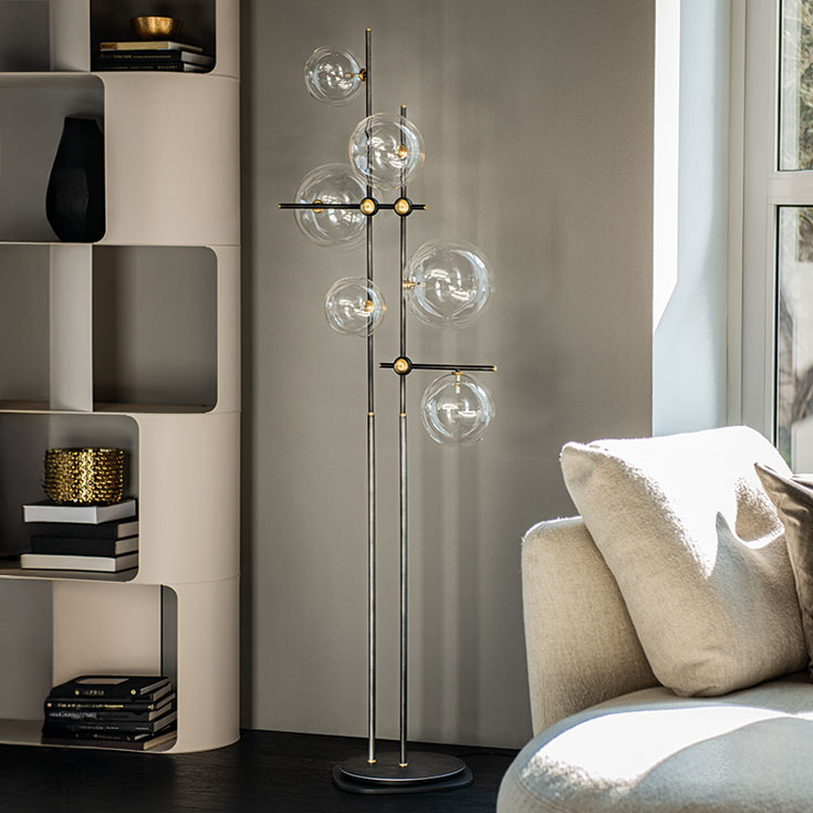 Lampada a soffitto con struttura in acciaio verniciato iron grey satinato e dettagli in ottone spazzolato. Paralumi in vetro borosilicato trasparente. Attaco a soffitto in acciaio cromo nero (06). Piantana con struttura in acciaio verniciato iron grey satinato e piastra di base in acciaio verniciato goffrato nero (GFM73) e dettagli in ottone spazzolanto. Lampadine incluse non dimmerabili. Optional telecomando e ricevitore solo per le versioni O/LO e V/LV.