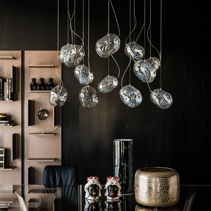 Attaco a soffitto in acciaio cromo nero. Paralume in vetro borosilicato iridescente o verniciato fumé. Cavi in acciaio inox. Impianto illuminante a 1107220V, lampadina attaco G4 inclusa. Dimmerabile con lampadina idonea (non inclusa) e multidimmer (non incluso).