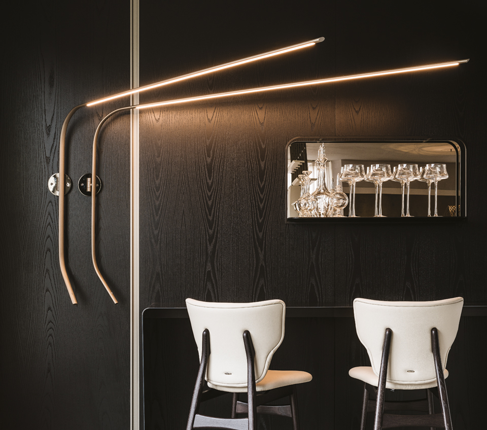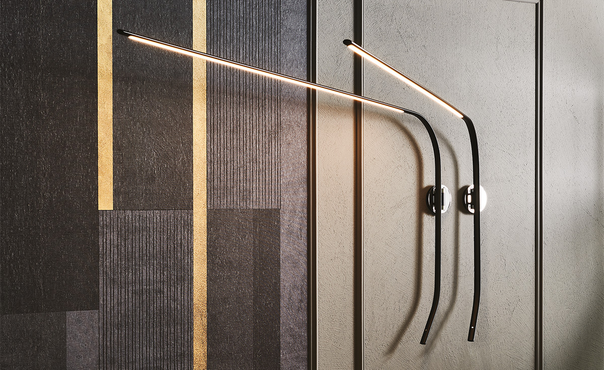 Lampada orientabile da parete con struttura in acciaio verniciato goffrato titanio (GFM11) o nero (GFM73). Attaco a parete in acciaio cromo nero (06). Iluminazione a LED.