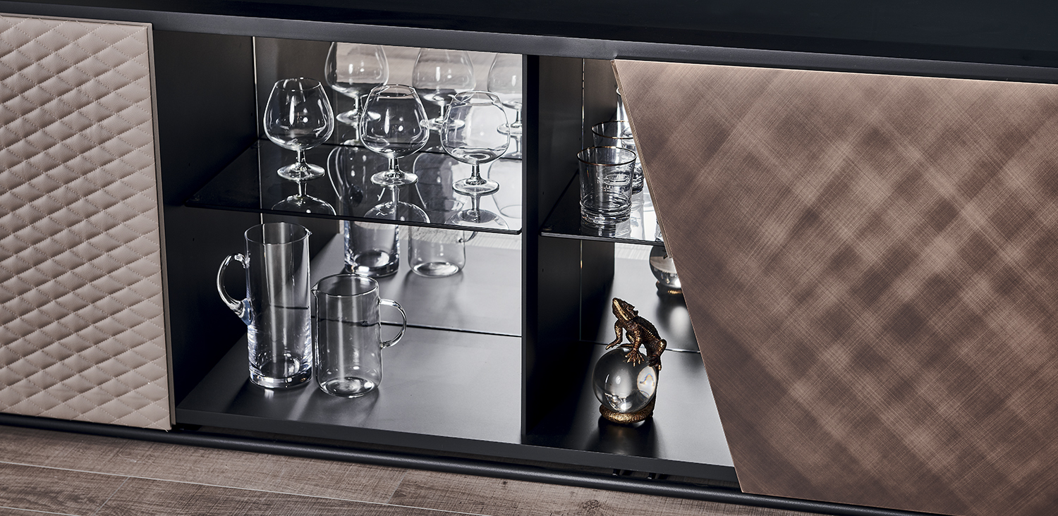 Contenitore in MDF e truciolare nobilitato verniciato goffrato. Anta sx composta da un telaio in alluminio verniciato titanio, laminato, polistirolo, acciaio verniciato a polveri epossidiche con rivestimento in pelle. Anta dx in MDF impiallacciato in essenza di legno con maniglia in acciaio cromato nero.