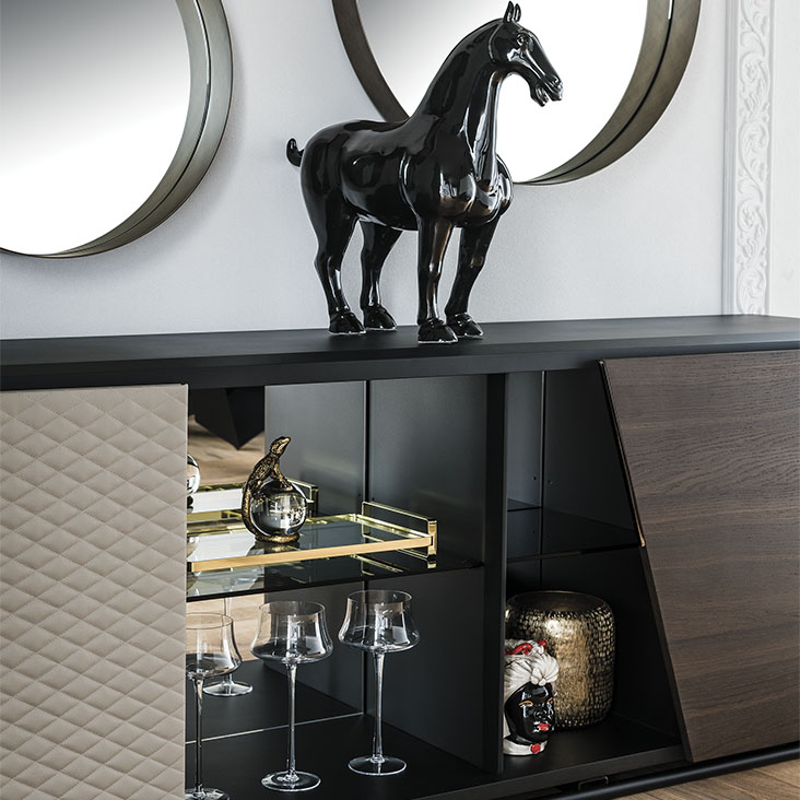 Madia contenitore in legno goffrato nero (GF73) e base in acciaio goffrato nero (GFM73). Anta sinistra rivestita in ecopelle o pelle trapuntata nei colori come da campionario con profili in alluminio verniciato titanio (GFM11) goffrato. Vano centrale con specchio.