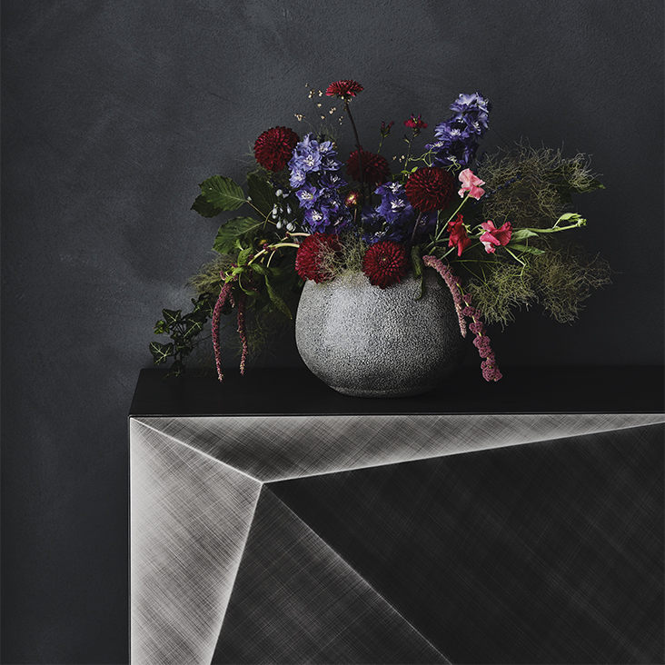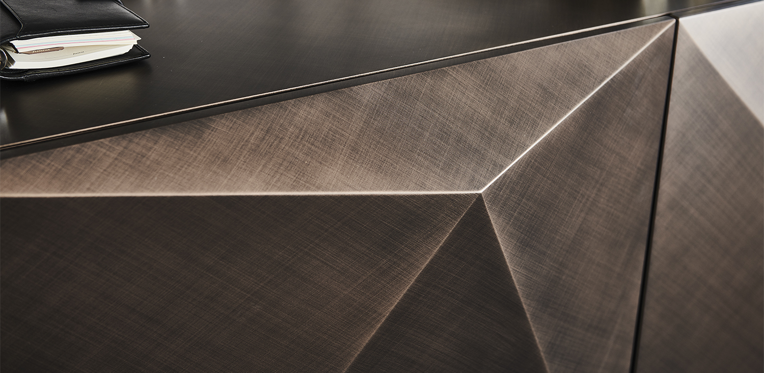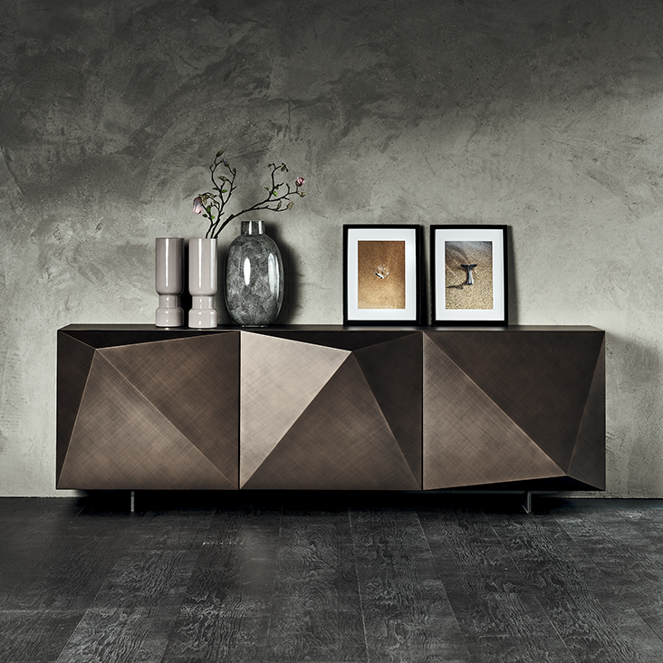 Madia contenitore a due o tre ante in legno laccato titanio (M11), Brushed Bronze o Brushed Grey. Piedini in acciaio inox lucido o verniciati graphite (OP69) opaco. Ripiani interni in cristallo trasparente. Optional: cassetto interno posizionabile su ognuna delle ante. Variazione cromatiche e spazzolatura della finitura Brushed sono caratteristiche della lavorazione artigianale e on sono da considerarsi difetti.